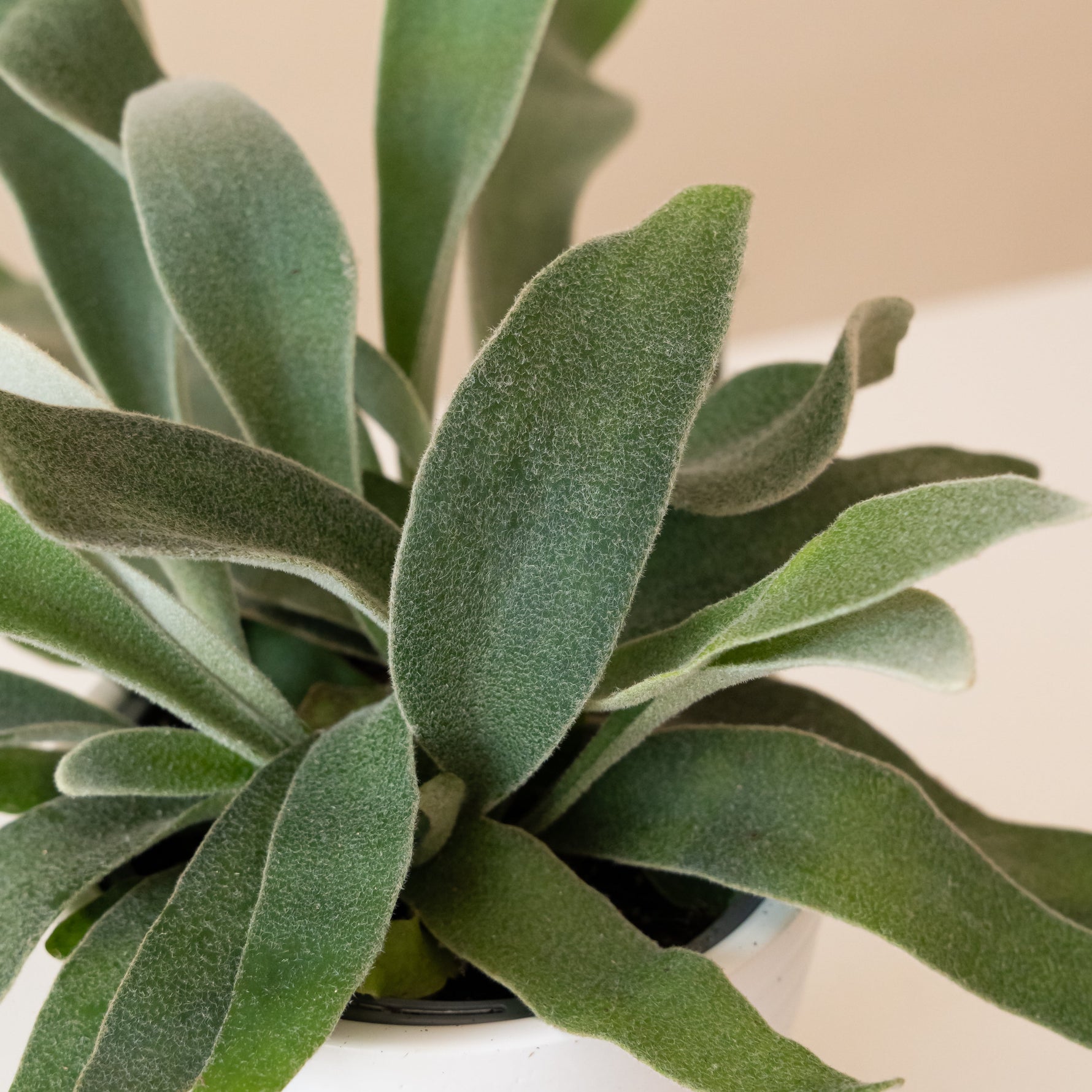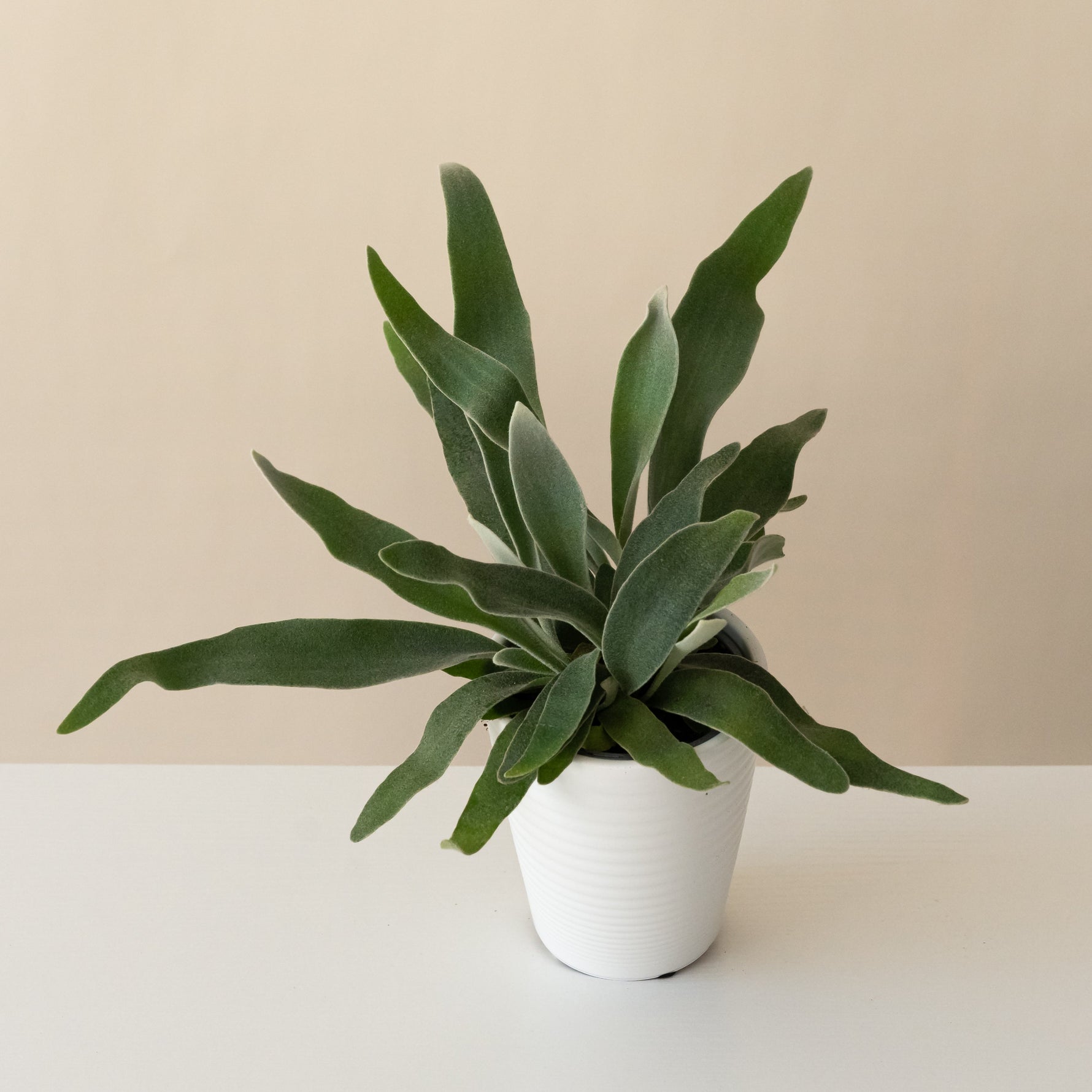 Ribbon Dance™ is the more compact, narrow-leaved counterpart to Sword Dance™, perfect for adding a little leafjoy® in your collection. This silver staghorn fern is aptly named for its strappy, elongated fronds which sway together like ribbons. These fronds are embellished with tiny scale-like hairs that give a silvery, felted appearance and help Ribbon Dance™ absorb nutrients and retain moisture. That said, avoid using leaf shine products or wiping away this layer of fuzz. In nature, staghorn ferns typically grow as epiphytes on the surface of other plants, such as clinging to the crook of a tree. Consequently, they don’t require much soil fertility, can thrive in diffuse or indirect sunlight, and prefer to dry out completely in between watering.
