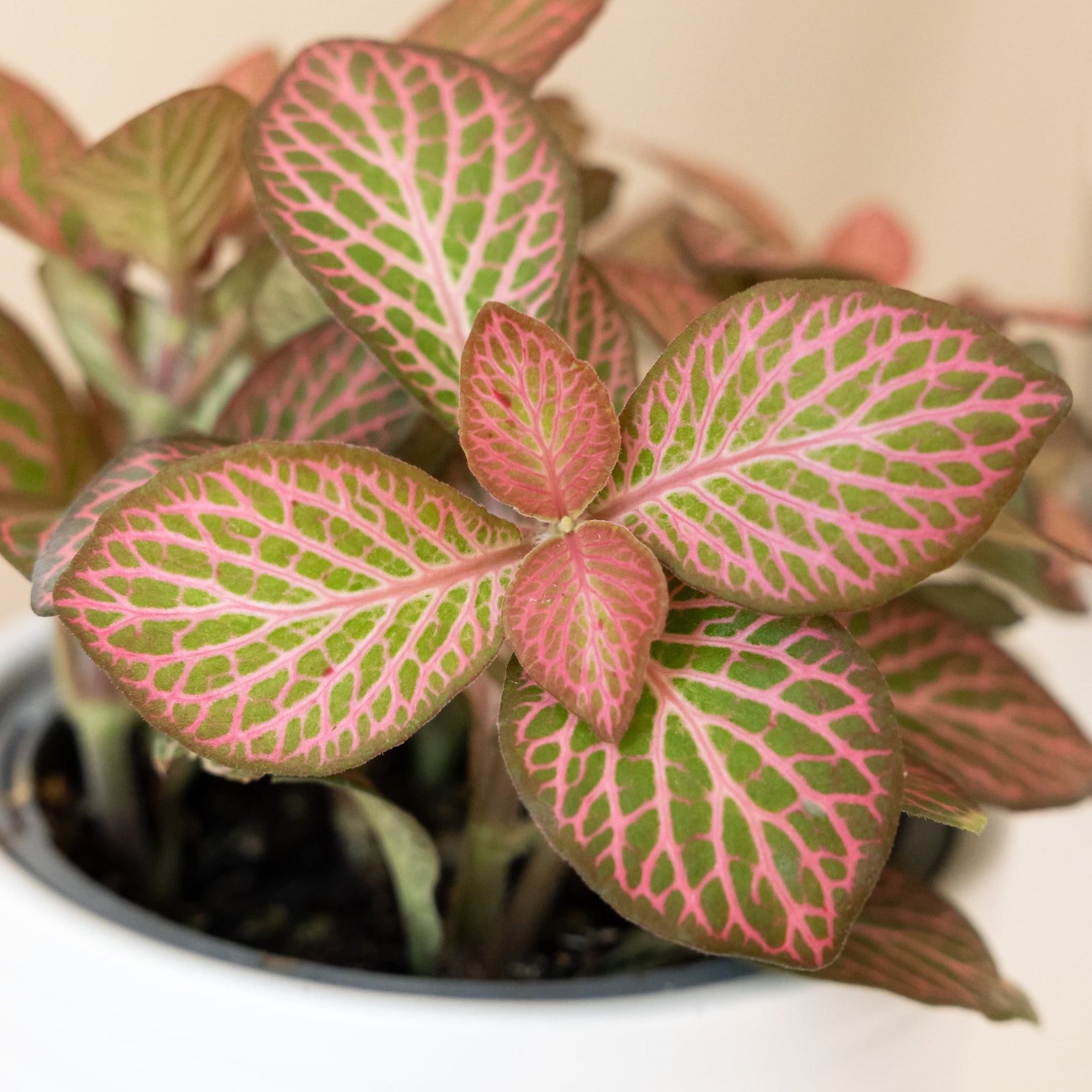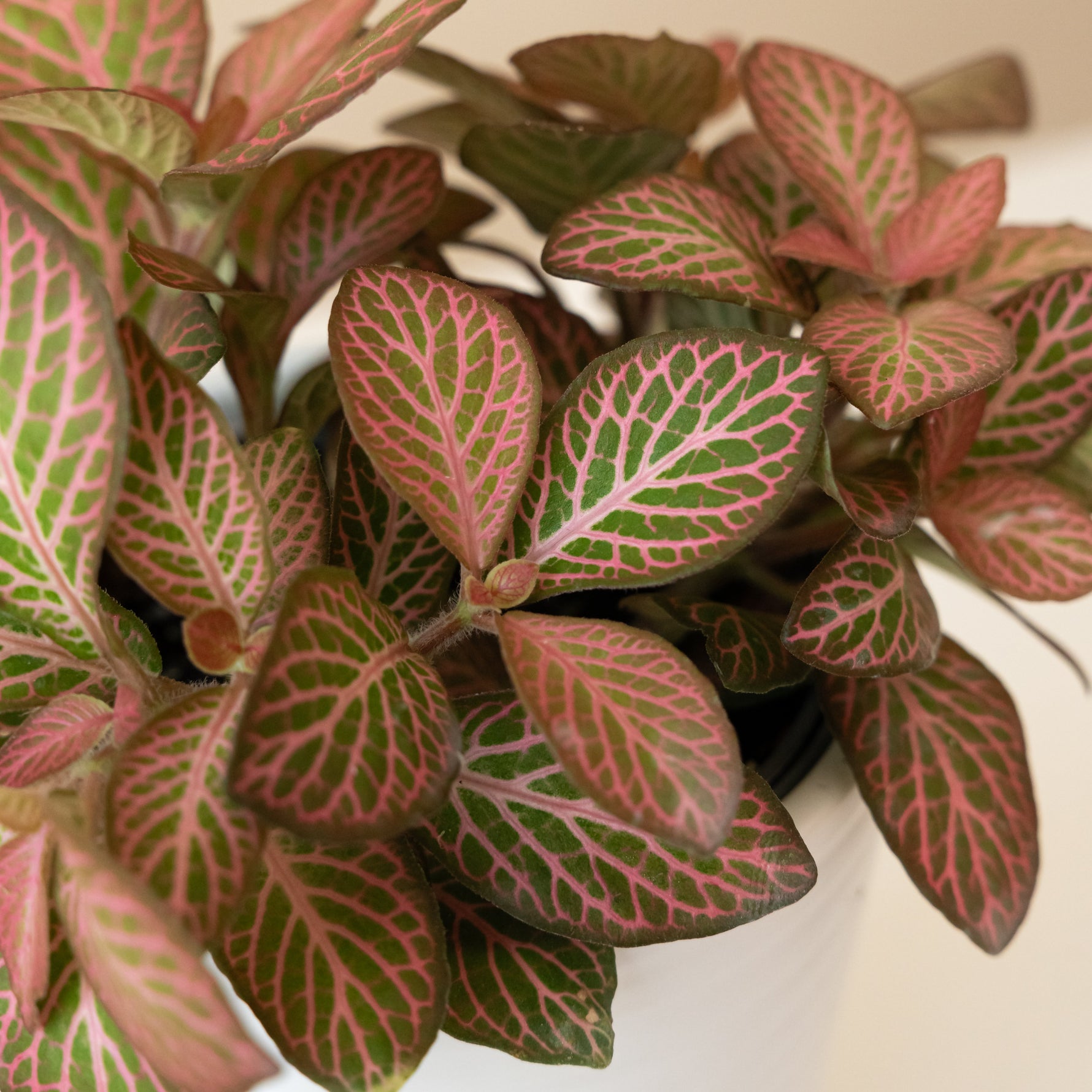 Network News ‘Dispatch’ is the pink counterpart to Network News ‘Media’ with low-growing, creeping leaves of lime green with pink veining. Unlike most nerve plants, the pink veining on ‘Dispatch’ bleeds into the margins of the leaves, giving the appearance of a plant that is almost more pink than green. Like other Fittonias, ‘Dispatch’ loves bright light and humidity.