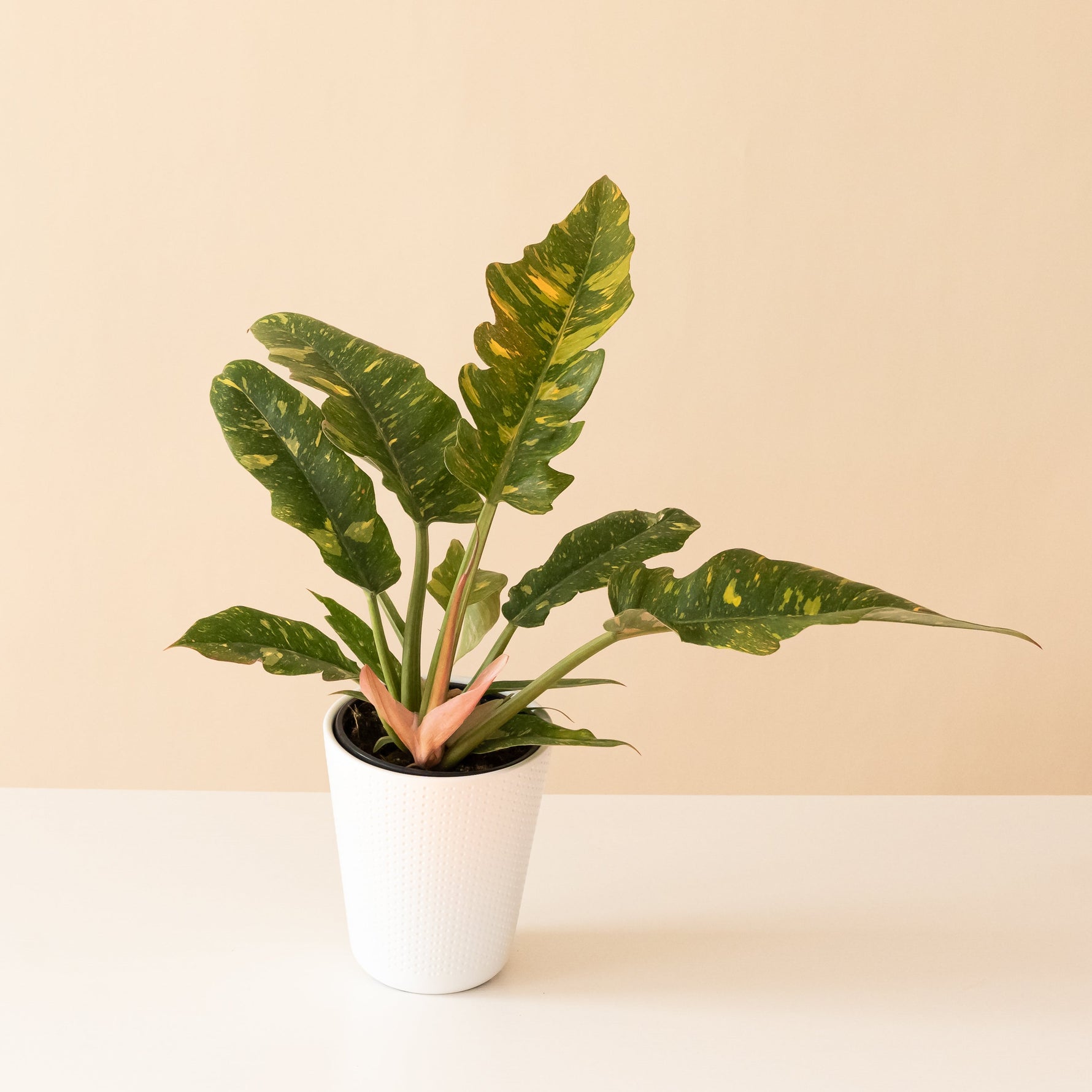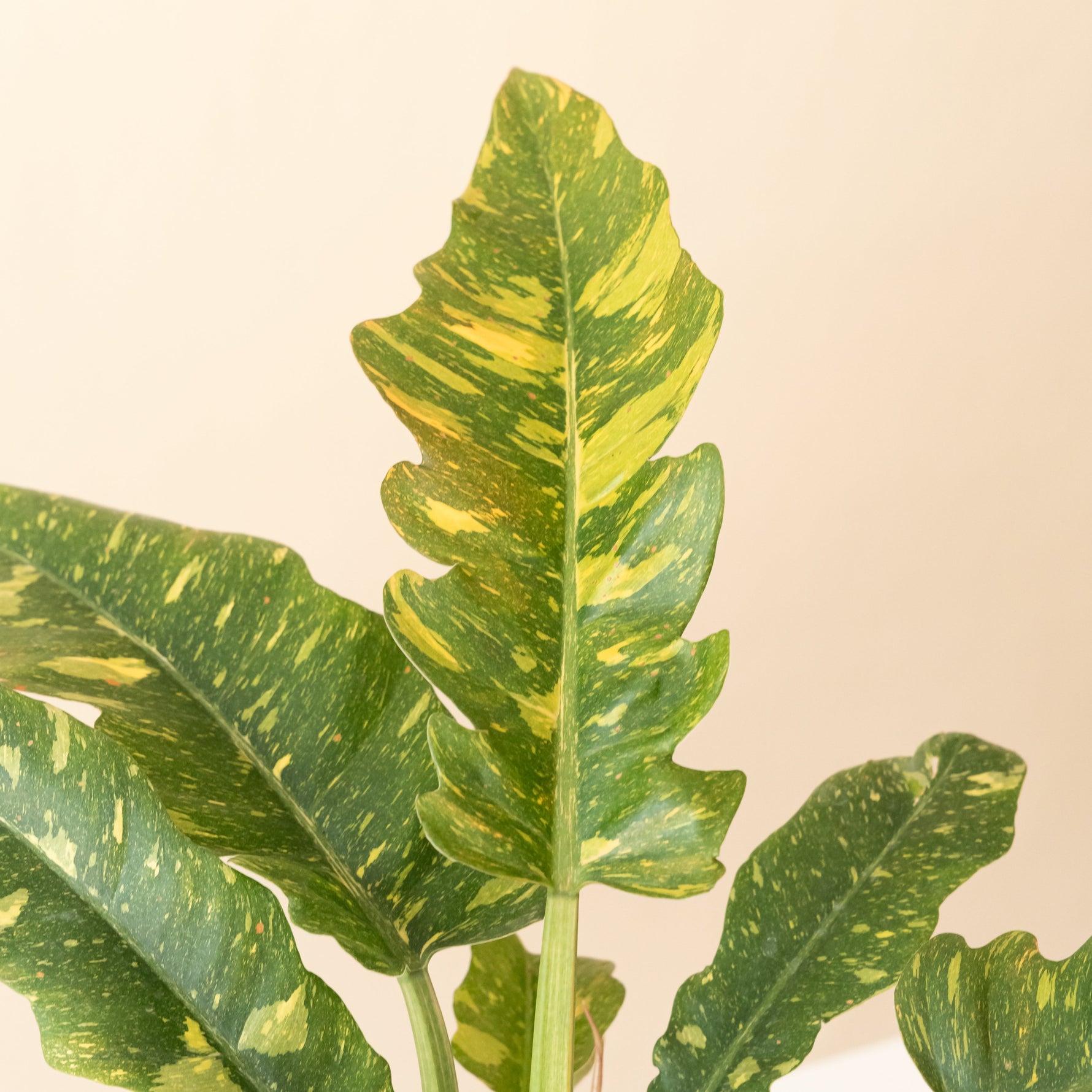 Meet Prismacolor ‘Golden Girl,’ a philodendron that’s as good as gold. She has elongated, lance-shaped leaves with toothy edges. Her shiny, bright green leaves are flecked in golden variegation. On occasion, pops of red, bronze, or orange will adorn her leaves, stems, and sheaths. Given the proper support, such as a moss pole, ‘Golden Girl’ will ascend skyward on her quest for a golden crown. Like other philodendrons, ‘Golden Girl’ is adaptable to her environment & easy to care for; bright, indirect light will result in the most pronounced variegation.